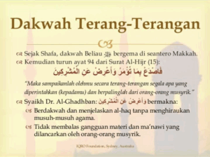Setelah Rasulullah Saw. berdakwah secara sembunyi-sembunyi (Dakwah Secara sirriyah) selama kurang lebih 3 Tahun. Rasulullah Saw. mendapatkan perintah dari Allah Swt. Agar berdakwah secara terang-terangan (Dakwah secara Jahriyyah). Dalil Naqli yamg memerintahkan Rasulullah Saw. berdakwah secara teramg-terangan adalah surah Al-Hijr/15 Ayat : 94.