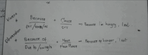 Contoh | I’m tired because I didn’t sleep. | I’m tired because of lack of sleep. | My tiredness is due to lack of sleep. |